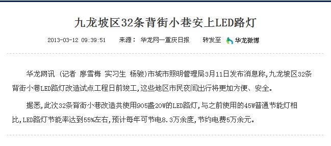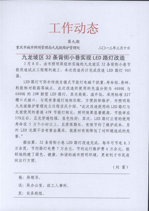 Congratulations from Chongqing City Lighting Management Bureau to organize, our R & D and manufacturing of "ten Hui card" Beijiexiaoxiang integration easy disassembly LED special energy-saving lamps "Jiulongpo Beijiexiaoxiang energy-saving pilot project successfully completed (case - outdoor lighting energy-saving http://www.biaoshufanyi.com/gongchengshishianli/shiwailvsezhaomingjienenggaizaoanli/2013-10-14/16.html). Please see the Hualong network and Chongqing City Lighting Management Bureau Maintenance Management Office published the "dynamic Jiulongpo 32 Beijiexiaoxiang LED street reconstruction":