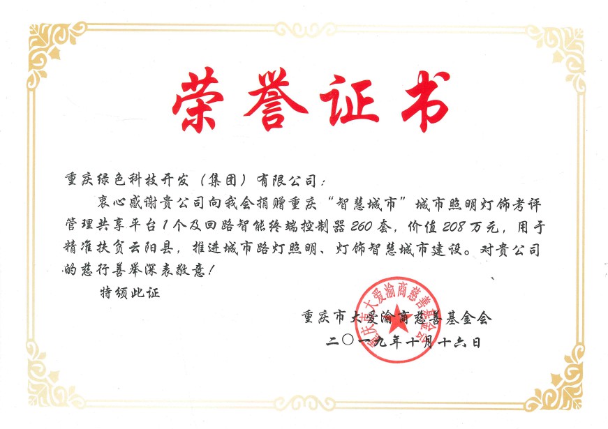 10月16日,重慶綠色科技開發(fā)(集團)有限公司為支持國家級重點貧困縣精準(zhǔn)扶貧工作,積極推進智慧城市建設(shè),通過重慶市大愛渝商慈善基金會,向云陽縣市政設(shè)施管理所捐建了回路智能終端控制器260套,以及配套建設(shè)重慶“智慧城市”城市照明燈飾四級考評管理共享平臺1個,總價208萬元,用于解決云陽縣城市路燈照明智能化管理的問題,幫助云陽縣實現(xiàn)市政府在《重慶市城市綜合管理提升行動方案》提出的城市照明“一把閘刀”管理的要求。