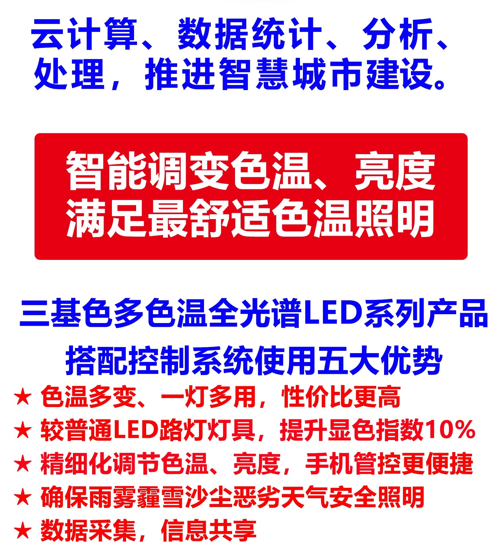 四、一盞三基色多色溫全光譜LED人工智能路燈色溫照明,可替代多盞普通單色溫LED路燈色溫照明,性價(jià)比更高,有效提高顯色指數(shù)、光效10%,色彩鮮艷度15%,燈具使用壽命更長(zhǎng)。