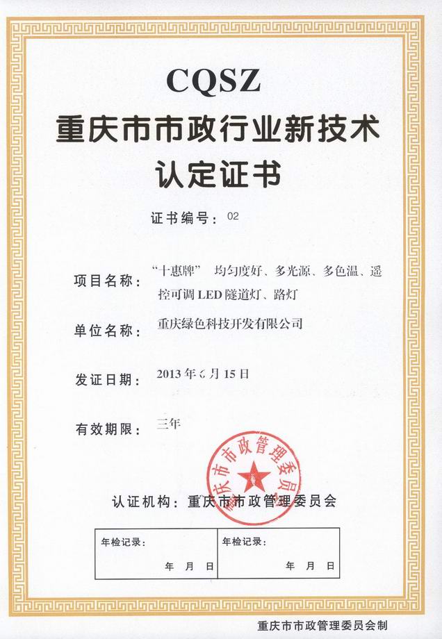 《市政行業(yè)新技術(shù)認(rèn)證證書(shū)》 (“十惠牌”均勻度好、多光源、多色溫、遙控可調(diào)LED隧道燈、路燈)
