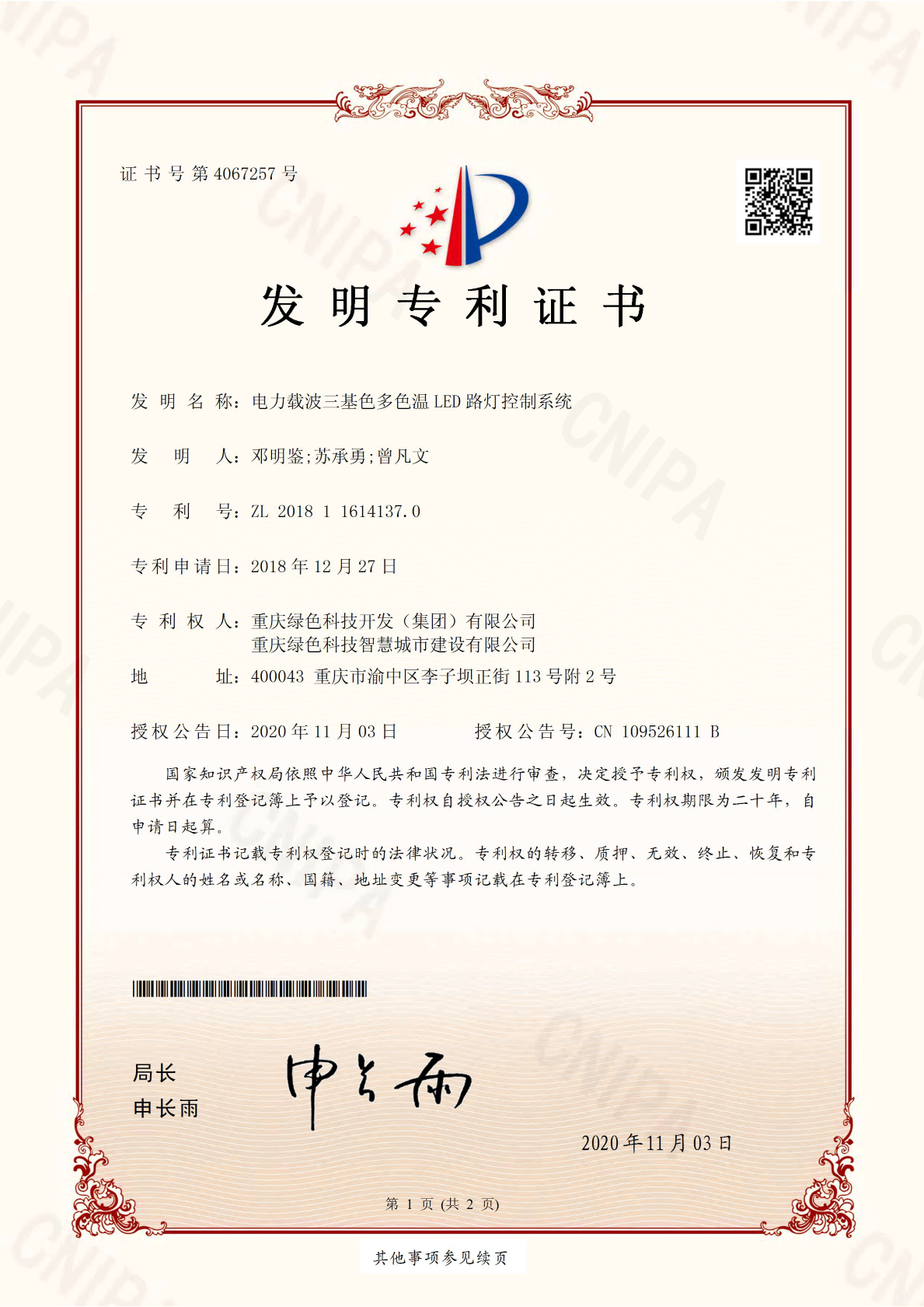 近日,重慶綠色科技開發(fā)(集團(tuán))有限公司再度喜獲一項國家發(fā)明專利《電力載波三基色多色溫LED路燈控制系統(tǒng)》(專利號:ZL 2018 1 1614137.0)。