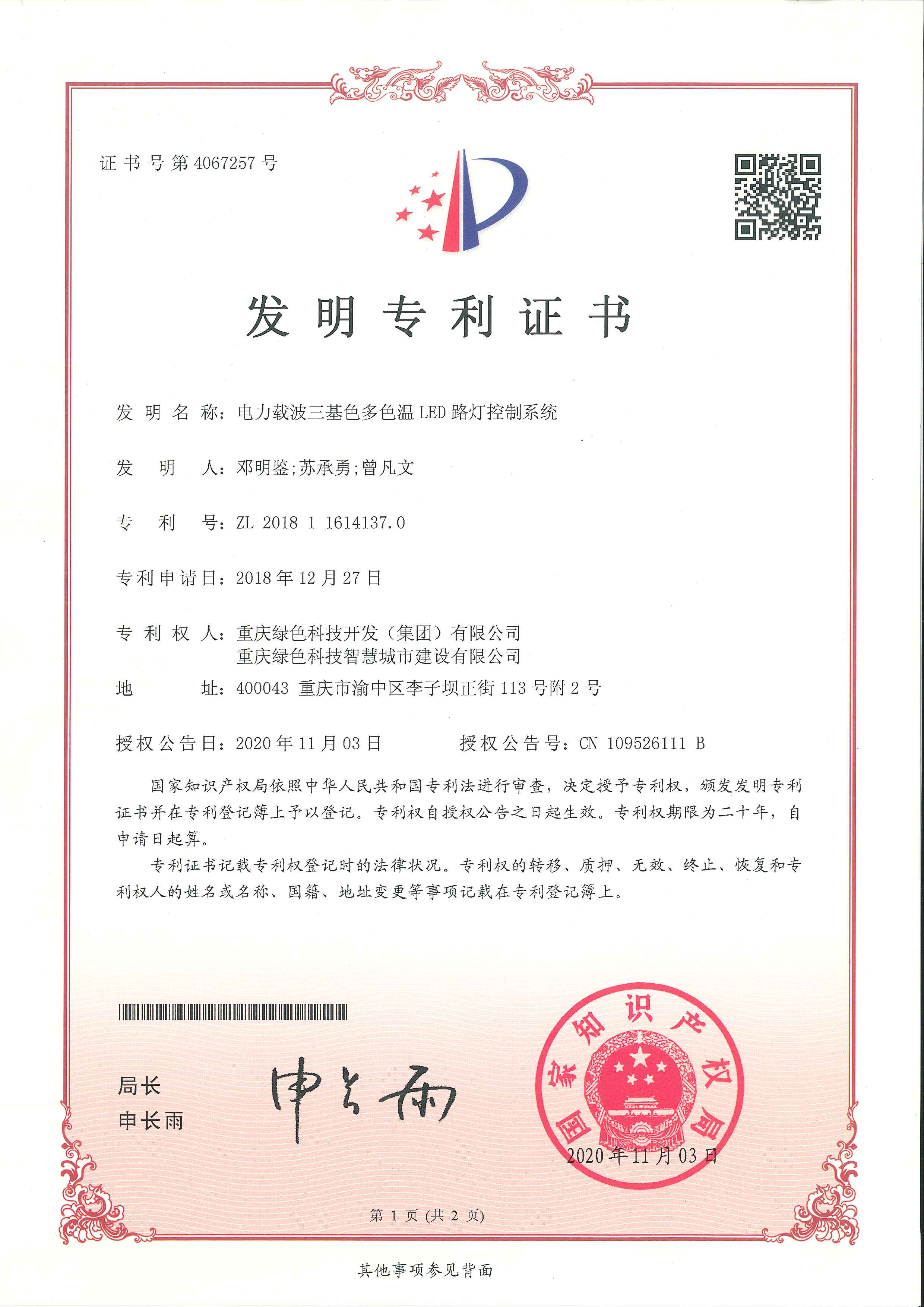 《電力載波三基色多色溫LED路燈控制系統(tǒng)》(專(zhuān)利號(hào):ZL 2018 1 1614137.0)